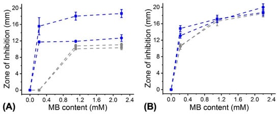 Zone of inhibition of E. coli (A) and S. mutans (B) following testing with PAFs electrospun with varied MB content. (■): 60-min light irradiation; (■) 60-min dark incubation. (●): 30-min light irradiation; (●): 30-min dark incubation. Results are reported as mean ± SD (n = 3). Lines are guideline to the eye.