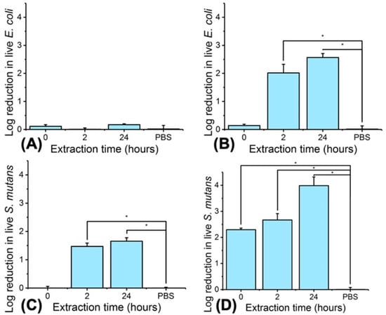 Agar plate testing of E.coli (A,B) and S. mutans (C,D) with 0–24-h extract of fibres MB2- PLGA50-CL50. (A,C) 60-min incubation in dark. (B,D) 60-min light irradiation. Results reported as mean ± SD (n = 3). ‘*’ denotes significantly different means (p < 0.05, t-test).