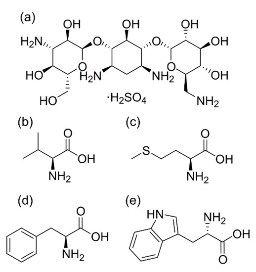 Figure 1. Chemical structures of (a) kanamycin sulfate, (b) L-valine, (c) L-methionine, (d) L-phenylalanine, and (e) L-tryptophan.