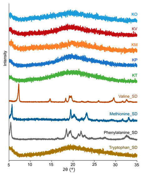 Four different amorphous kanamycin-amino acid systems (kanamycin-valine (KV), kanamycin-methionine (KM), kanamycin-phenylalanine (KP), and kanamycin-tryptophan (KT)) were produced by co-spray drying, as evidenced by the PXRD data (Figure 2). Kanamycin itself produced amorphous particles (KO) when spray dried alone, which was consistent with our previous study [18]. When amino acids were spray dried alone, all but tryptophan precipitated in crystalline form suggesting the possibility of a homogeneous amorphous matrix. Amorphicity was also confirmed using FTIR and Raman spectroscopy (Section 3.2.4).