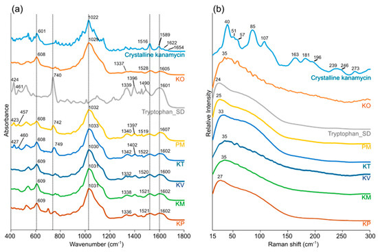 Figure 3. Representative (a) Fourier Transform Infrared (FTIR) and (b) Low-Frequency Raman (LFR) spectra of the different particles. From top to bottom: Crystalline kanamycin, kanamycin only formulation (KO), spray-dried tryptophan (Tryptophan_SD), a physical mixture (1:1) of amorphous kanamycin and amorphous tryptophan (PM), kanamycin-tryptophan formulation (KT), kanamycin-valine formulation (KV), kanamycin-methionine formulation (KM), and kanamycin-phenylalanine formulation (KP).