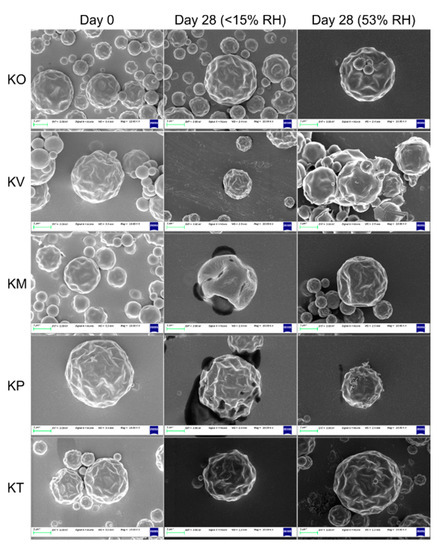 Figure 4. Representative SEM images of the formulations (kanamycin only (KO), kanamycin-valine (KV), kanamycin-methionine (KM), kanamycin-phenylalanine (KP), and kanamycin-tryptophan (KT)) on day 0 and day 28 when stored at 25 °C/<15% RH and 25 °C/53% RH.