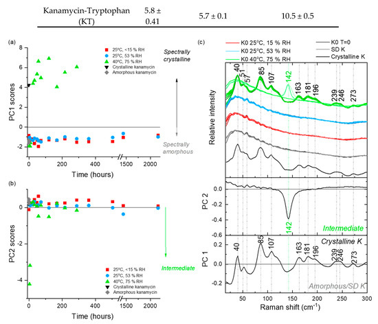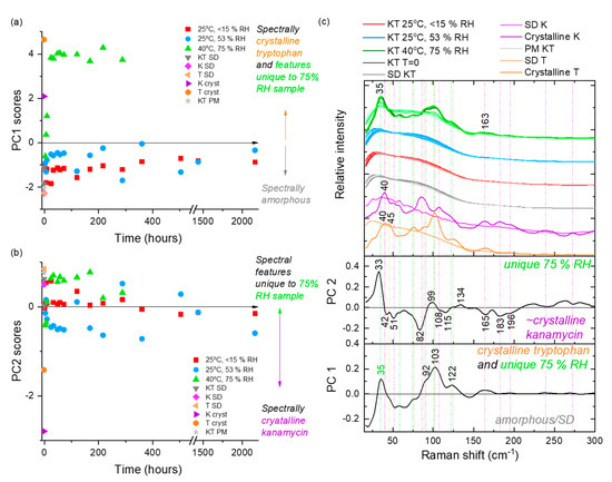 Figure 7. PCA analysis of the LFR spectra collected from KT samples stored under three different conditions (25 °C/<15% RH, 25 °C/53% RH and 40 °C/75% RH) over time. (a) PC1 scores versus time, (b) PC2 scores versus time, and (c) the associated loadings with comparative spectra. PM represents a physical mixture of amorphous kanamycin and amorphous tryptophan in a 1:1 molar ratio. PC 1 accounts for 83% of the explained spectral variance and PC 2 accounts for a further 7% explained variance. Spectra from the different storage conditions in (c) have slight color graduations to highlight early (lighter coloring) versus latter (darker coloring) time points.