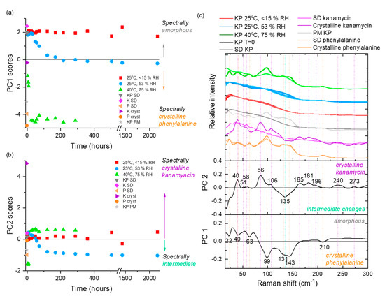 Figure 6. PCA analysis of the LFR spectra collected from KP samples stored under three different conditions (25 °C/<15% RH, 25 °C/53% RH and 40 °C/75% RH) over time. (a) PC 1 scores versus time, (b) PC 2 scores versus time, and (c) the associated loadings with comparative spectra. PM represents a physical mixture of amorphous kanamycin and crystalline phenylalanine in a 1:1 molar ratio. PC 1 accounts for 83% of the explained spectral variance, and PC 2 accounts for a further 11% explained variance. Spectra from the different storage conditions in (c) have slight color graduations to highlight early (lighter coloring) versus latter (darker coloring) time points.