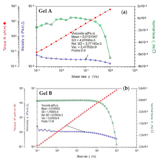 Dynamic viscosity of (a) Gel A and (b) Gel B performed in the range of 0.11 to 100 s−1 at 35 °C.