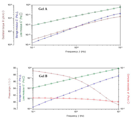 Before oscillation frequency sweep, an amplitude sweep test was performed to define the fluid’s linear-viscoelastic region (LVER), and 10% at least for both formulations. Indeed, for Gel A, the amplitude sweep test performed at 1 Hz between 0.1 and 100% did not indicate any output of the linear domain. For Gel B, the oscillation measured between 0.1 and 100% of deformation did not show any upper limit and so, caution should be used to avoid not being below 1.5% deformation with this rheometer (Supplementary Materials Figure S7). At 0.1 Hz, the storage module was negligible, which explains why some points are missing on the graphs (negative values cannot be displayed on a logarithmic scale). For both at low amplitudes, the signal becomes lower than the sensitivity of the material (0.05 μNm).