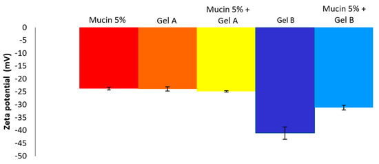 Zeta potential values (mean ± SD, n = 3) of mucin 5%, Gel A, Gel B, and mucin 5% + Gel A or Gel B.