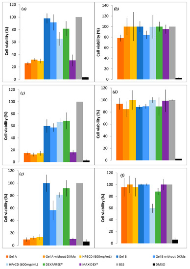Cell viability of Gels A and B with or without DXMa, HPβCD (600 mg/mL) and HPγCD (600 mg/mL) aqueous solutions, DEXAFREE®, and MAXIDEX®. (a) 5% concentration during 30 min, (b) 0.05% during 30 min, (c) 5% during 2 h, (d) 0.05% during 2 h, (e) 5% during 24 h, (f) 0.05% during 24 h.