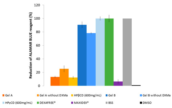 Reduction of ALAMAR BLUE® reagent (%) of Gels A and B with or without DXMa, HPβCD (600 mg/mL) and HPγCD (600 mg/mL) aqueous solutions, DEXAFREE®, and MAXIDEX®.