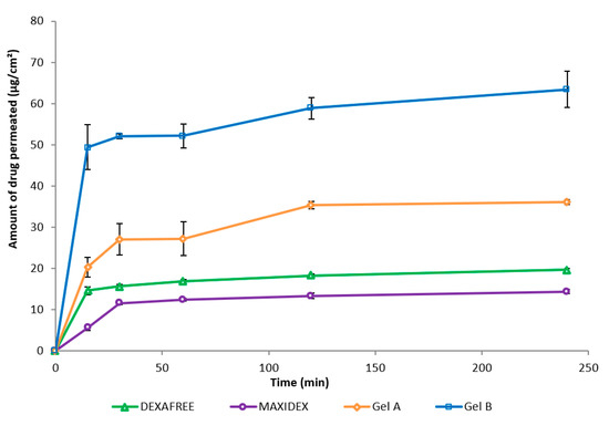 Amount of drug permeated (mean ± SD, n = 3) through the excised cornea of Gels A and B, DEXAFREE®, and MAXIDEX® as a function of time.
