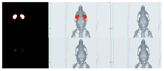 PET (left), CT (right), and fused image PET/CT (center) of the rat eyes immediately after administration (top) and 300 min post-administration (bottom).