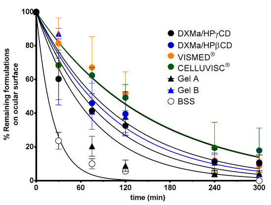 Ocular biopermanence of Gels A and B, DXMa (10 mg/mL)/HPβCD (600 mg/mL), DXMa (30 mg/mL)/HPγCD (600 mg/mL), VISMED®, and CELLUVISC® versus BSS.