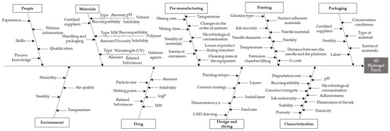 An Ishikawa diagram, also known as fishbone diagram, is one of the seven basic tools of quality management. This tool was used to establish which variables could have an impact on the desired quality of the product. First, a brainstorm session was performed to identify and list potential risk parameters. Subsequently, the list was reviewed to extract relevant causes in the context of the main problem, the 3D hydrogel patch, which is represented in the “fish head”. The potential causes of the problem, derived from the brainstorming session and research, were then organized in the “fish bones” of the Ishikawa diagram (Figure 1). A total of nine potential causes were listed: people, environment, materials, drug, pre-manufacturing, design and slicing, printing, characterization, and packaging. Each factor was subdivided to show the relationship of all potential causes to the presenting problem.