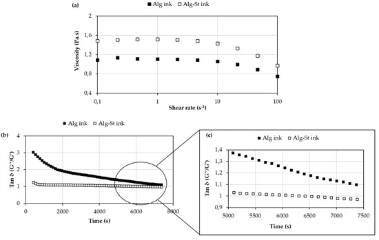 Considering the rheological results obtained before gelation, it would be expected that an increase in viscosity would lead to a slower rearrangement of the conformations of the polymer chain (longer gelation time). However, a detailed assessment of the interaction between the elastic and viscous modules may be more accurate to draw such conclusions. Tan δ (G’’/G’), the loss or damping factor, is often used to describe the viscoelastic behavior in samples when there is a phase transition [30,31]. In rheology, tan (δ) quantifies the balance between energy loss and storage. The fact that G’ increases at higher time means that structural changes took place. In Figure 2b,c, Tan δ (G’’/G’) is presented as a function of time sequence. As previously mentioned in Section 2.2.4. the onset of gelation time was recorded as the time when a minimum of 7 successive data points showed the sol/gel transition point. It can be observed that a decrease of Tan (δ) values revealed that both materials act more elastic than viscous, having more potential to store the load rather than dissipating it. Nevertheless, during gelation, the elastic (G’) and viscous modulus (G’’) of the Alg-St ink were similar and lower than the corresponding values obtained for the Alg ink. For Alg ink, G’ and G’’ were significantly different, with the viscous module being significantly higher than the elastic module (Tan (δ) > 1). The results show that the addition of starch has a direct influence on the elastic properties of the printed patch, which is reflected in a shorter gelation time (6780 s) compared to the Alg ink (> 7200 s), Figure 2c. In fact, only in Alg-St ink it was observed a phase transition at 7000 s, (Tan (δ) <1), (Figure 2c). This means that the character of the sample has changed during the measurement from the liquid to the solid or gel state. The data corroborate the results reported by Viyoch et al. [32], which showed that the addition of starch can improve the elasticity of the printed patch. However, a faster gelation time can affect the structural integrity of the construct. Furthermore, the non-saturation of the polymeric system led to a nonuniform distribution of calcium ions through the system, which induced the formation of large clusters, maximizing the formation of heterogeneous gelled networks. This type of process also increased the gelation time. Thus, in subsequent studies, gelation was induced by saturation of the system.