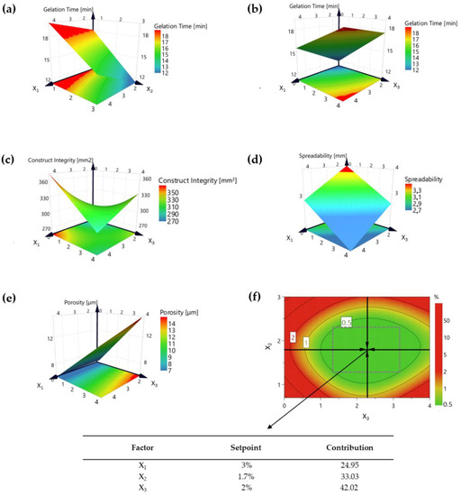 According to Kuo et al. [31], a higher concentration of polymer results in an increase in viscosity, leading to a slower rearrangement of the conformations of the polymer chain. This effect was observed, although not considered significant. In addition, previous studies have shown that a rapid gelation time leads to nonuniform crosslinking, which in turn can have a negative impact on the final properties of the product [19]. Hence, this type of parameter must be carefully evaluated, and for an adequate adjustment, it is necessary to tune the ratio CaCl2·2H2O–polymer(s) in function of the QTPP defined. Regarding construct integrity, the interaction X1×3 was disclosed as the most influencing term (p < 0.05) and revealed an antagonistic effect on the considered CQA (Figure 3c). In terms of spreading, none of the interactions under study had a distinct and significant impact on this parameter (Figure 3d). As observed in Figure 3e, the pore size increased with increasing starch percentage. The coefficient value revealed a synergetic impact on the X3 term. Furthermore, the overall results suggest that the addition of starch to an alginate-based 3D system can be advantageous for future drug release modulation strategies.