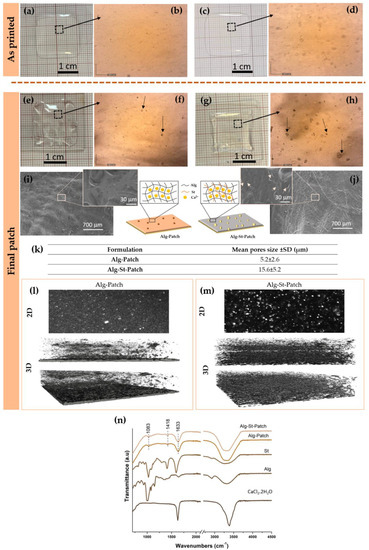 Effect of starch on the physicochemical properties of the 3D Alg and Alg-St patches before (as printed) and after crosslinking (final patch): Macroscopic and optical observations of Alg-Patch (a,b) and Alg-St-Patch (c,d) as printed; macroscopic and optical observations of Alg-Patch (e,f) and Alg-St-Patch (g,h) after crosslinking; scanning electron microscopy (SEM) images of Alg-Patch (i) and Alg-St-Patch (j) at 50× and 1000×; pore size distribution (k), Surface morphology, and topography of Alg-Patch (l) and Alg-St-Patch (m)—2D and 3D confocal data at 50×; and ATR-FTIR spectra of Alg and Alg-St patches, the crosslinker (CaCl2·2H2O), and alginate and starch powder (n).