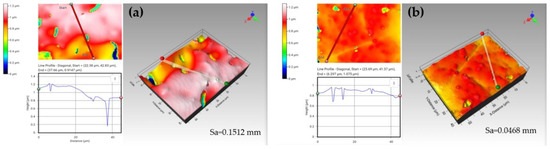 Digitally processed bidimensional and tridimensional profilometric images, their correspondent pores depth profiles, and surface roughness (Sa) are shown in Figure 6. The results reveal clear morphological and topographic differences between the Alg-St-patch and Alg-patch. The Alg-patch presents deeper valleys and peaks (Figure 6a), while the Alg-St-Patch presents a more cohesive and homogeneous structure (Figure 6b), which is reflected in average surface roughness (Sa) results, with the Alg-Patch showing a higher Sa than Alg-St-Patch.