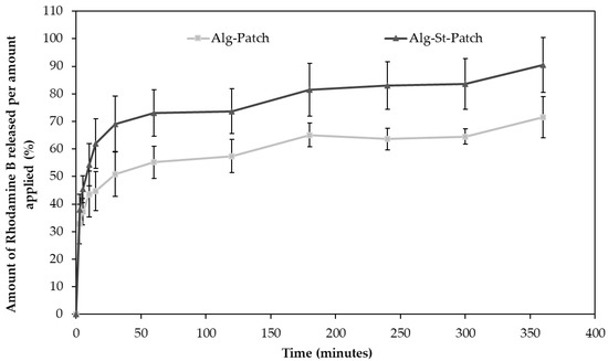 The drug release rate from 3D patches is dependent on the drug solubility, influx of the medium into the structure, and polymer(s) swelling [38]. The release of the model drug Rhodamine B (RB) from the 3D patches matrices was faster in the first 30 min and slower afterwards, showing a burst effect possibly caused by rapid dissolution of freely soluble RB bound at the surface of the patches (Figure 7). The higher burst effect noticed on the Alg-St-patch can be attributed to the starch swelling properties. After 360 min, 71.51% of the Alg-patch drug content had been released whereas the optimized Alg-St-patch released 90.46% of the probe.