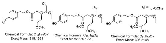 - Karkoula, E.; Skantzari, A.; Melliou, E.; Magiatis, P. Quantitative measurement of major secoiridoid derivatives in olive oil using qNMR. Proof of the artificial formation of aldehydic oleuropein and ligstroside aglycone isomers. J. Agric. Food Chem. 2014, 62, 600–607. [Google Scholar] [CrossRef] [PubMed]