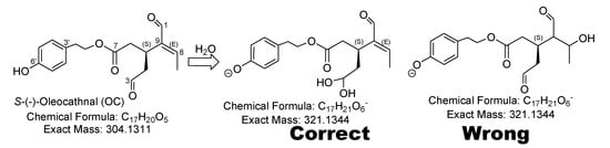 It is not clear if the authors used specific software to filter out any non-oleocanthal metabolites and/or analog fragments. For example, the well-established fragment 4-hydroxy-ethylbenzene is a key diagnostic mass fragment for (-)-oleocanthal [4,5,6]. The authors did not explicitly indicate whether they used this fragment or any MS–MS fragmentation of any obtained peak to confirm the metabolites’ identity and correlate them with the tyrosol moiety of the parent (-)-oleocanthal via obtaining this diagnostic fragment, as shown in Figure 3. There was no interpretation of the fragments listed in Table 1 [1], nor any proposed potential fragmentation schemes, which clearly indicate mass–mass fragmentation was not used for metabolites identity confirmation. Furthermore, the authors did not explain why the metabolism will target breaking the α,β-unsaturated conjugation Δ8,9 system by hydration and hydrogenation and leave the highly reactive C-3 aldehyde unreacted [2,3,4]. While it is not clear if the authors detected any ester hydrolysis products, which is a very likely metabolic/chemical pathway expected to precede the Phase I and Phase II metabolic pathways. The exposed linear ester bond can be an easy target for esterase enzymatic or pH-induced hydrolysis.