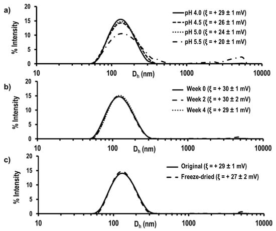 The aforementioned pseudo-block microstructure and the hydrophobic–hydrophilic balance provided the copolymers with the necessary properties for self-assembling by nanoprecipitation. NPs presented a hydrophobic core mainly formed by covalently linked KT and a hydrophilic shell mainly formed by VI. Nanoprecipitation method was performed as previously described, and NPs were labeled as KT NPs. SEM micrograph of the NPs confirmed the successful NPs’ formation presenting spherical shape, slight polydispersity in size, and diameter of about 100 nm (Figure S4). Regarding hydrodynamic properties, a positive ξ value of +30 ± 1 mV was obtained, confirming the presence of VI protonable amine groups on the surface of the NPs and, according to literature, an indication of good stability in suspension []. They presented Dh of 117 ± 1 nm with low PdI values (0.139 ± 0.004). The spherical morphology, positive surface charge and diameters between 100 and 200 nm made KT NPs suitable for accumulation at inflamed areas [,] as well as for an improved sequestration by inflammatory cells avoiding lymphatic drainage [,]. The diameter or surface charge of KT NPs did not significantly vary with the different final concentration on the aqueous phase or final volumes under study. Within the studied ranges, the key variable was the concentration of copolymer in the organic phase, which, when increased, led to NPs with 50 nm larger diameter (Table 1). Finally, in order to explore the most suitable conditions for NPs storage, a pH study, stability in suspension study, and freeze-drying study were performed. Figure 2a shows the size distribution and the ξ values of the KT NPs at different pH values (i.e., 4.0, 4.5, 5.0, and 5.5). At pH 5.5, a broadening of the size distribution curve and an increase in the intensity of the peak in the microscale, which might correspond to agglomerated NPs, were observed. A decrease in surface charge was observed as pH increases due to deprotonation of amine groups of VI as the pH approaches to the pKb of VI (pKb = 5.0–6.0). The reduction in the electrostatic repulsion between particles caused NPs aggregation. Therefore, the synthesis was carried out at pH 4 (0.1 M acetic acid) to ensure the protonation of VI and the good stability of the NPs over time. Figure 2b shows that, under these conditions, there were no significant changes in the hydrodynamic properties of KT NPs at 0 days, 14 days, and 28 days when stored at 4 °C. Furthermore, NPs recovered their initial hydrodynamic properties after freeze-drying and dispersion in the buffer solution at pH 4.0 when sonicated for 10 min with an ultrasound tip (30% amplitude) (Figure 2c). Therefore, NPs can be stored in powder or in suspension at pH 4.0 and 4 °C for at least one month.