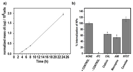 (a) Normalized mass of coumarin-6 (c6) internalized per cell at different time points for 47c6-KT NP, and (b) %internalization of 47c6-KT NPs at 37 °C (NONE, positive control), 4 °C (negative control), and at 37 °C after pre-treatment with chlorpromazine (CHL), amiloride (AMI), and nystatin (NYST) (*: significant difference compared to NONE, * p < 0.05).