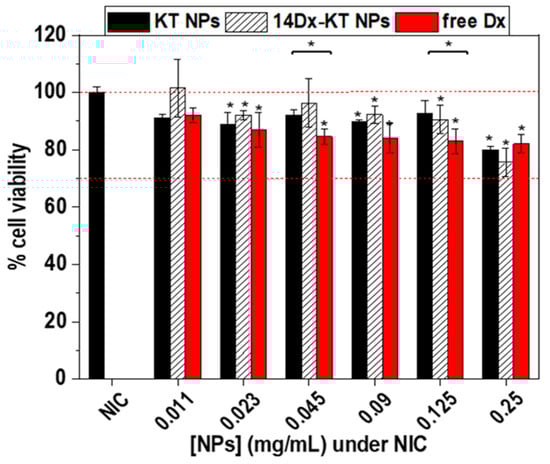 Cell viability of RAW264.7 macrophages treated with different concentrations of unloaded KT NPs (black), 14Dx-KT NPs (dashed white), or free Dx (red) over 24 h. The diagrams include the mean, the standard deviation (n = 8), and the ANOVA results (* p < 0.05 statistically significant difference with cells under non-inflammatory conditions (NIC) and between the different systems).