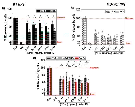 NO release by RAW264.7 macrophages after 24 h (black) and 48 h (dashed white) with no treatment (NIC), treatment with LPS alone (IC,U), and treatment with LPS and different concentrations of (a) unloaded KT NPs and (b) 14Dx-KT NPs; (c) NO release after 48 h with no treatment (NIC), treatment with LPS (IC,U), and treatment with LPS and different concentrations of loaded NAP NPs or KT NPs (black), 8Dx-NAP NPs or 14Dx-KT NPs (dashed white), or free Dx (red). The diagrams include the mean, the standard deviation (n = 8), and the ANOVA results (* p < 0.05, *** p < 10−3, and # p < 10−5 statistically significant difference with IC,U cells or between 24 h and 48 h time points).