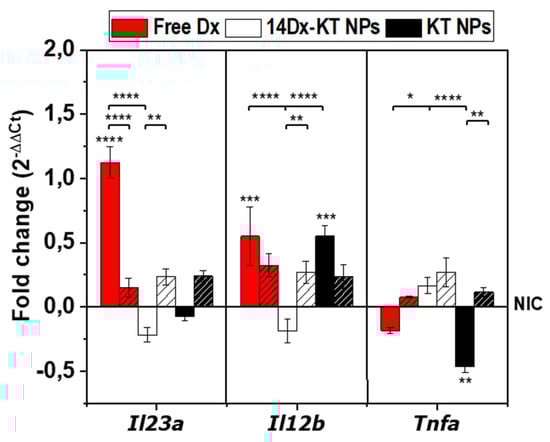 The transcript levels of M1- (Il12b, Il23a, and Tnfa) and M2- (Tgfb1, Il10, and Vegfa) related genes were determined by quantitative RT-PCR. RAW264.7 cells were incubated 24 h with culture medium (non-inflammatory conditions, NIC) or with LPS (5 μg/mL) to simulate inflammatory conditions (IC,U), and either non-treated or treated with unloaded KT-NPs (0.045 mg/mL; NPs:DMEM (1:5, v/v)), 14Dx-KT NPs (5.1 μM Dx and 0.045 mg/mL NPs; NPs:DMEM (1:5, v/v)), or free Dx (5.1 μM). Media were collected after 24 h of treatment to eliminate non-internalized NPs or free Dx, and cells were further incubated in culture medium up to 7 days. Culture medium was refreshed every 48 h. Total RNA was extracted from cells after 1 and 7 days of NPs addition. PureLink RNA Mini Kit (Applied Biosystems, Foster City, CA, USA) was used for this purpose following manufacturer’s instructions []. RNA concentration was quantified by measuring absorbance at 260 and 280 nm in a NanoDrop 1000 spectrophotometer (Thermo Scientific) and 40 ng RNA/sample were transformed into cDNA using a MultiScribe reverse transcription-based reaction kit (Applied Biosystems) in the presence of an RNAse inhibitor (N8080119, Applied Biosystems) in a MyCycler thermocycler (Bio-Rad; with the following temperature profile: 25 °C—10 min, 37 °C—2 h, 85 °C—5 min, 4 °C—∞). Table S1 shows the list of specific primers used for quantitative PCR (all from Sigma). The reaction was performed using the Power SYBR Green PCR Master Mix (Applied Biosystems), in an ABI PRISM 7900HT Real-Time PCR System (Applied Biosystems with the following temperature profile: 95 °C—15 s, 60 °C—60 s, 40 cycles). Melting curves were generated in order to verify the specificity of the amplification (15 s, from 60 °C to 95 °C). RT-qPCR expression data were analyzed according to the 2−ΔΔCt method (Livak et al., 2001) or as 2−ΔCt normalized to β-actin, and array views were generated using MeV software.
