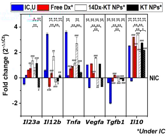 Quantitative real-time PCR data. Graphical presentation of gene transcript levels of M1 markers (Il23a, Il12b, and Tnfa) and of M2 markers (Vegfa, Tgfb1, and Il10) in samples treated with LPS (500 ng/mL) and either treated with culture media (IC,U, blue), free dexamethasone (free Dx, 5.1 μM, red), Dx-loaded ketoprofen-bearing NPs (14Dx-KT NPs, 5.1 μM Dx and 0.045 mg/mL NPs, white), and unloaded ketoprofen-bearing NPs (KT NPs, 0.045 mg/mL, black) for 1 day (plain) or 7 days (dashed). Results were expressed relative to the corresponding level of expression of each transcript in non-inflammatory conditions (RAW264.7 alone, NIC). The diagrams include the mean, the standard deviation (n = 2), and the ANOVA results (#—comparison with IC,U control, # p < 0.05, ## p < 0.01, and ### p < 0.001; *—comparison between systems, * p < 0.05 and ** p < 0.01).