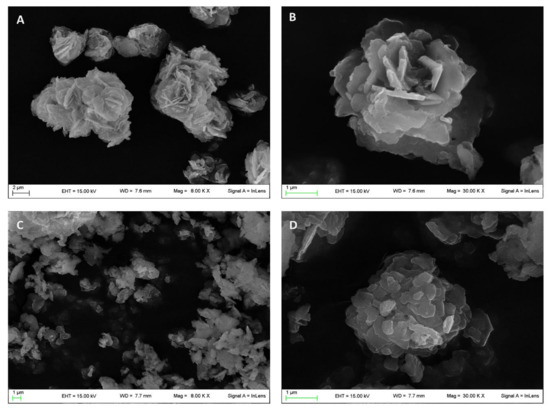 The morphological analysis carried out by scanning electron microscopy (SEM) showed the typical desert-like rose structure of pristine ZnAl-NO3 crystals (Figure 2A,B) [24] having dimensions in the range of 1–10 µm. The intercalation procedure induced the modification of this morphology, as can be observed from the micrographs reported in Figure 2C,D appearing fragmented with rounded edges, while the dimensions were maintained in the same range of the raw ZnAl-NO3.