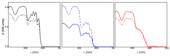 The spectrophotometric analysis conducted on the samples under investigation before and after irradiation at 330 nm enabled us to evaluate and compare their photostability. In all cases, after 2 h of irradiation, the optical density changed (ΔOD) in the 250–400 nm range and was detected even if the relative variations were different (Figure 4). In particular, KET showed a smaller variation, compared to the other samples, in the whole spectral range investigated (black line Figure 4, Table 1). This behavior indicated that KETH had a higher photostability, in agreement with the literature data [26], where the photodecomposition of ketoprofen is reported to be pH-dependent, and a higher photodegradation is observed when the drug is in the anionic form. Therefore, KETH was not a good reference for the intercalated samples. KET-Na showed a remarkable increase in the absorption upon corresponding irradiation (blue line Figure 4, Table 1); this indicated that the deprotonated drug had a photostability lower than KETH, also when in powder form. Since the drug was intercalated in an anionic matrix, KET-Na was considered a good reference for assessing the photochemical behavior of the intercalation compound.