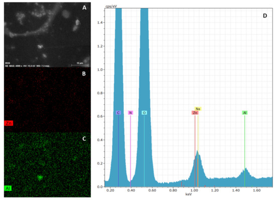 SEM analysis of ZnAl-KET loaded patch: micrograph (A), zinc mapping (B), aluminum mapping (C) and edx spectrum (D). Magnification 4999 X.