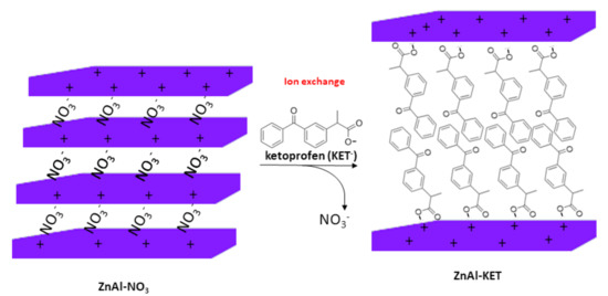 Schematic representation of the ion exchange between NO3− ions in the pristine ZnAl-HTlc (ZnAl-hydrotalcite) and KET− (ketoprofen).