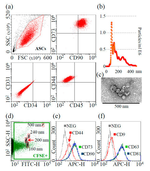 Characterization of ASCs and ASC-EVs. (a) Flow cytometry analysis of MSC (CD73, CD90 and CD44) and hemato-endothelial (CD31, CD34 and CD45) markers, presence and absence, respectively, confirming ASCs identity. Representative plots are shown. (b) Representative NTA plot of ASC-EVs; (c) Transmission electron micrographs of ASC-EVs showing particles with characteristic cup-shaped morphology. (d) Flow cytometry of FITC-labeled calibrating nanobeads (framed in red, from 160 to 500 nm) assuring calibration of flow cytometer and comparison with CFSE-labeled ASC-EVs (framed in green); (e) Presence of MSC-markers CD44, CD73 and CD90 on CFSE-labeled ASC-EVs. Representative plot is shown under the FITC + gate of EVs + CFSE; (f) Presence of EV-markers CD9 (weak), CD63 and CD81 on CFSE-labeled ASC-EVs. Representative plots are shown under the FITC + gate of EVs + CFSE.