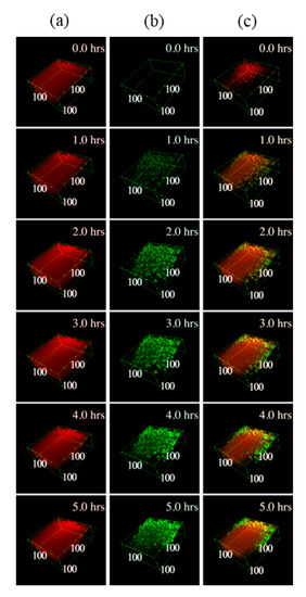Three-dimensional (3D) reconstructions of the pellet micromass during the time-lapse. In column (a) the CARS signal at 2848 cm−1 originating mainly by the cells lipid structures is shown in red, in column (b) the TPEF signal related to the EVs fluorescence is shown in green, while in column (c) the two channels are merged. In the top right corner of each image is depicted the related timeframe and close to the boundary box are shown the dimensions in μm starting from the origin vertex.