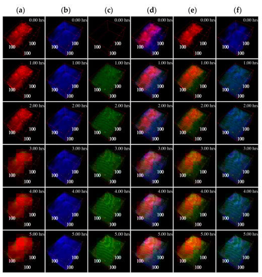 3D reconstructions of the cartilage during the time-lapse. In column (a) the CARS signal is shown in red at 2848 cm−1 originating mainly in the cells lipid structures; in column (b) the SHG signal generated by the collagen is shown in blue; in column (c) the TPEF signal related to the EVs fluorescence is shown in green. In column (d) all the three signals are visualized together, while in column (e) only the CARS and the TPEF are visualized, and in column (f) only the SHG and the TPEF are visualized. In the top right corner of each image the related timeframe is depicted and close to the boundary box the dimensions in μm are shown starting from the origin vertex.