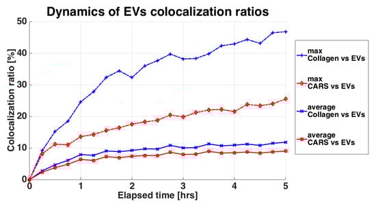 Variation of the co-localization ratios of the EVs with respect to the SHG signal and to the CARS signal. SHG is related to the collagen and thus the extracellular matrix, shown in blue. CARS is related to the lipid cell structures, shown in red. The curves indicate the maximum co-localization value and the average co-localization value computed from the set of Z slices composing the Z-stack for each timeframe.