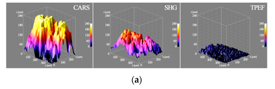 The experimental setup of the multimodal microscope allowed to collect images with Coherent Anti-Stokes Raman Scattering (CARS) combined with Second Harmonic Generation (SHG) techniques, as previously described [36], together with Two-Photon Excitation Fluorescence (TPEF) images (Figure S1).
