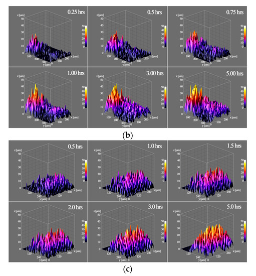 3D surfaces of the thicknesses extracted from the acquired and processed data. (a) The 3D surface on the left is related to the thickness of the cartilage cell structure computed from the CARS signal, in the center, the 3D surface is related to thickness of the collagen and thus the ECM from the SHG signal, while on the right the 3D surface is related to the EV penetration depths in the cartilage after 5 h from the TPEF signal; (b) the 3D surfaces show the dynamic of the EV penetration in the cartilage during the time-lapse; in the top right corner of each image the related timeframe is depicted; (c) the 3D surfaces show the dynamic of the EV penetration in the chondrocytes micromass during the time-lapse, in the top right corner of each image the related timeframe is depicted.