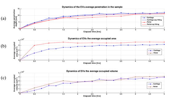 Dynamics of the EV uptake in the samples during the time-lapse experiment in terms of the average thickness of penetration, the average occupied area and the average occupied volume. (a) the dotted curves show the average EV penetration depth in the cartilage (blue) and the chondrocytes pellet (red), while the continue curves plot the related exponential fit for the cartilage (blue) and the chondrocytes pellet (red); (b) the dotted curves show the average occupied area of the EVs in the cartilage (blue) and the chondrocytes pellet (red); (c) the dotted curves show the average occupied volume of the EVs in the cartilage (blue) and the chondrocytes pellet (red).