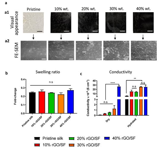 Electroconductive/active silk-based scaffolds. (a) Representative (a1) macroscopic visual appearance of silk-based films and (a2) FESEM micrographs at increasing rGO loading; scale bars at 5 mm and 10 μm respectively. (b) Swelling ratio (n = 3 per sample type). (c) Conductive properties (n = 4 per sample type) in the dry and hydrated states. The differences between the experimental groups were analyzed by one-way or two-way ANOVA using Tukey’s post hoc test for multiple comparison. n.s, nonsignificant; ** p < 0.01, **** p < 0.0001.