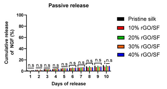 Delivery of nerve growth factor-β (NGF-β) from electroconductive/active silk-based scaffolds. Cumulative release percentage from the films (n = 3 per type) with passive release. The differences between the experimental groups were analyzed by two-way ANOVA using Tukey’s post hoc test for multiple comparison (p-value with respect to pristine silk). n.s, nonsignificant; ** p < 0.01.