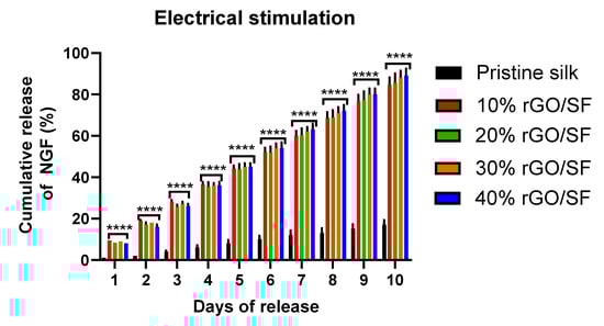 Electrically enhanced delivery of NGF-β from electroconductive/active silk-based scaffolds. Cumulative release percentage from the films (n = 3 per type) with electrical stimulation. The differences between the experimental groups were analyzed by two-way ANOVA using Tukey’s post hoc test for multiple comparison (p-value with respect to pristine silk). **** p < 0.0001.