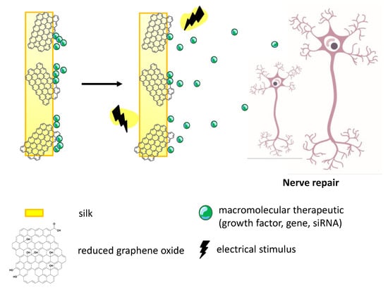 Schematic representation of electroresponsive biohybrid composites based on silk fibroin and reduced graphene oxide for the controlled release of macromolecular therapeutics.