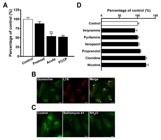Bafilomycin A1 is a known specific inhibitor of V-ATPase, which is expressed in acidic intracellular compartments, including the lysosome, and contributes to maintaining their acidic interior pH [24]. Pretreatment with bafilomycin A1 significantly reduced quinacrine uptake by TR-iBRB2 cells (Figure 1D), suggesting that quinacrine uptake is largely influenced by the interior acidic pH in the inner BRB. In addition, the acute treatment of cells with NH4Cl or FCCP is known to cancel the H+-gradient between the lysosomes and cytosol [23,24,25], and TR-iBRB2 cells showed a significant decrease in quinacrine uptake following acute treatment with NH4Cl or FCCP, whereas pretreatment with NH4Cl had no effect (Figure 2A), supporting that the acidic interior pH is important in quinacrine uptake in the inner BRB. In addition to the saturable and non-saturable transport processes, the present results suggest that the characteristics of quinacrine transport were similar to those of LTR reported previously [26], and this was also supported by the results of the confocal microscopy because the fluorescence signals of quinacrine and LTR were shown to merge, suggesting quinacrine was distributed to the lysosome (Figure 2B). Confocal microscopy with bafilomycin A1 or NH4Cl also supported the sequestration of quinacrine in acidic intracellular compartments at the inner BRB because the punctate quinacrine distribution was shown to be attenuated in TR-iBRB2 cells treated with these agents (Figure 2C).