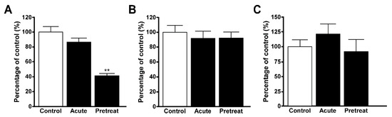 The uptake of quinacrine in the lysosome-enriched fractions of TR-iBRB2 cells was significantly inhibited by treatment with bafilomycin A1 (Figure 3A), and this was consistent with the results obtained in the cellular uptake with TR-iBRB2 cells (Figure 1D), supporting the distribution of quinacrine to lysosomes. The results of the inhibition study using several cationic drugs suggested that quinacrine interacted with desipramine, imipramine, propranolol and verapamil at the lysosome of the inner BRB, because quinacrine uptake in the lysosome-enriched fraction of TR-iBRB2 cells was significantly inhibited by these cationic drugs (Table 1). In addition, pyrilamine, clonidine, and nicotine had no effect on the uptake of quinacrine in the fractions of TR-iBRB2 cells (Table 1), and these results suggests that the interaction of these drugs in the lysosome is minor. These results also provide evidence that clearly supports previous reports of the carrier-mediated blood-to-retina transports of these agents across the inner BRB [13,14,15]. Similar results were also obtained with the lysosome-enriched fractions of RPE-J cells, used as an in vitro model cell line of the outer BRB (Table 1), and these results suggest the interaction of quinacrine with desipramine, imipramine, verapamil, and pyrilamine, and the blood-to-retina transport of clonidine and nicotine across the outer BRB.