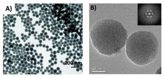 Transmission electron microscopy images of (A) nonporous silica nanoparticles (synthesised from SiO2 using the Stöber method). Reprinted with permission from [8]. Copyright (2011) American Chemical Society. (B) isothiocyanate-functionalized mesoporous silica nanoparticle made of TEOS and 3-aminopropyl triethoxysilane. Reprinted from [9].
