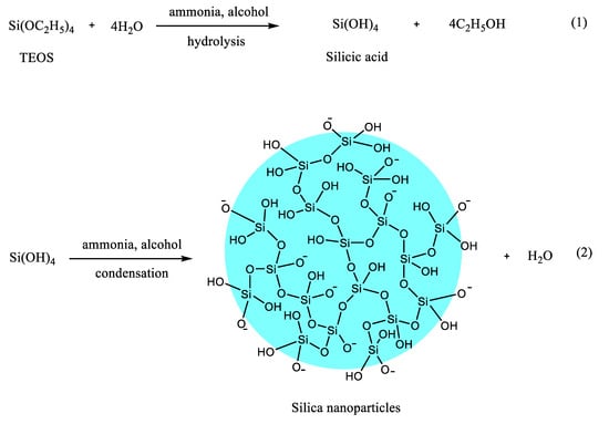 Traditionally, silica nanoparticles are prepared using the Stöber method [19], in which TEOS is used as the silica source, water and ethanol as solvents, and ammonia as a catalyst. This method generally involves the hydrolysis of TEOS to form silicic acid, followed by condensation of the silicic acid to produce silica particles with siloxane bridges (Si-O-Si) (Figure 2). Nucleation and particle growth are involved in the formation of the silica nanoparticles [20,21,22,23,24]. Nucleation is the formation of solid particles (nuclei) from soluble TEOS monomers in a homogenous liquid. Particle growth is achieved either through the addition of TEOS monomers to the nuclei [23,24], or the aggregation of the nuclei to form larger particles [20,25].
