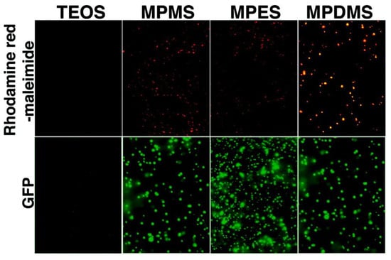Fluorescence microscopy images of surface modified thiolated organosilica and TEOS nanoparticles. The nanoparticles were mixed with rhodamine red maleimide (upper panels) and GFP (lower panels). TEOS: Tetraethylorthosilane, MPMS: 3-mercaptopropyltrimethoxysilane, MPES: 3-mercaptopropyltriethoxysilane and MPDMS: 3-mercaptopropylmethyldimethoxysilane. Reprinted with permission from [34]. Copyright (2008) American Chemical Society.
